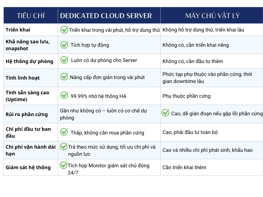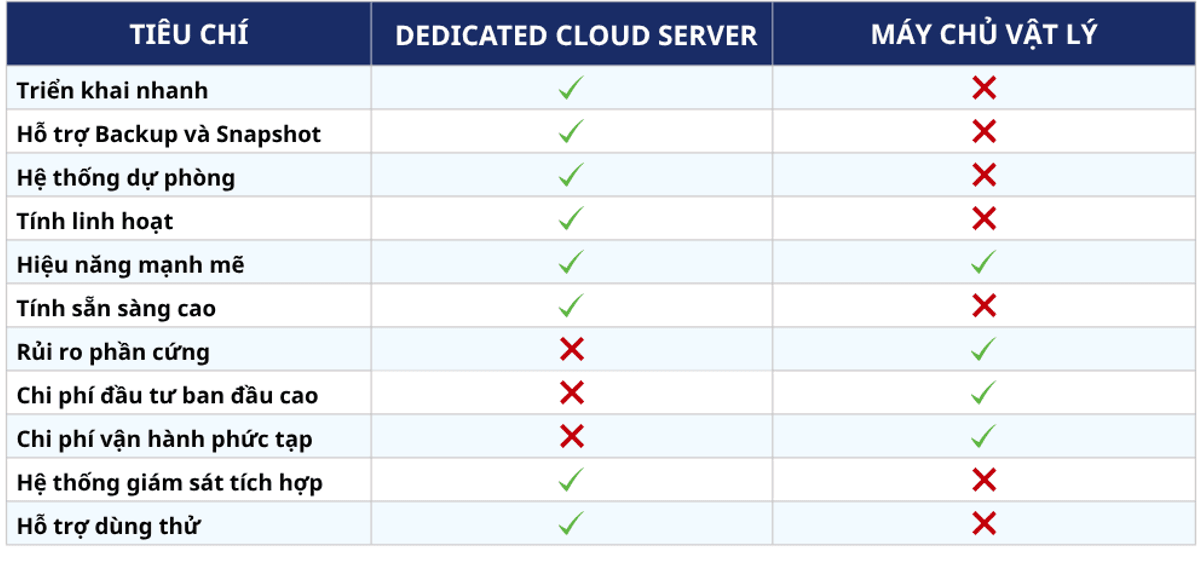 Bảng so sánh chi tiết dưới đây sẽ giúp bạn đánh giá toàn diện giữa hai giải pháp đang được quan tâm nhiều nhất, đồng thời làm rõ những ưu điểm vượt trội của Dedicated Cloud Server trong xu hướng hạ tầng hiện đại.